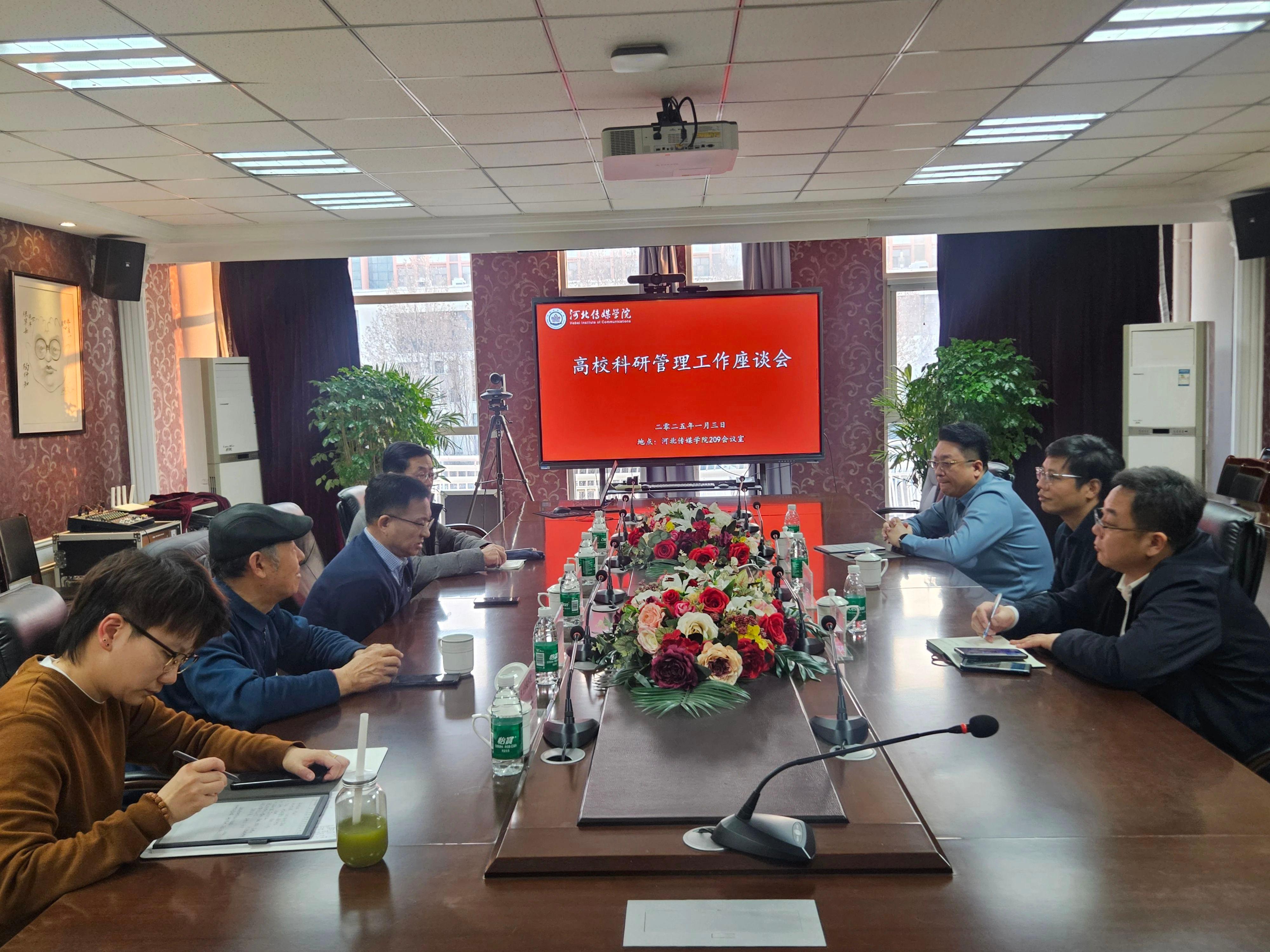 2025年1月3日,我校邀请河北大学科研处副处长顾岩峰、河北科技大学科研处处长王波和河北中医药大学科研处副处长李斯,在兴安校区召开高校科研管理工作座谈会。会议由副校长李建平致辞、科研处处长董孟怀主持,新闻传播学院院长张金桐、副院长朱良志以及影视艺术学院副院长李峰等参加座谈会。